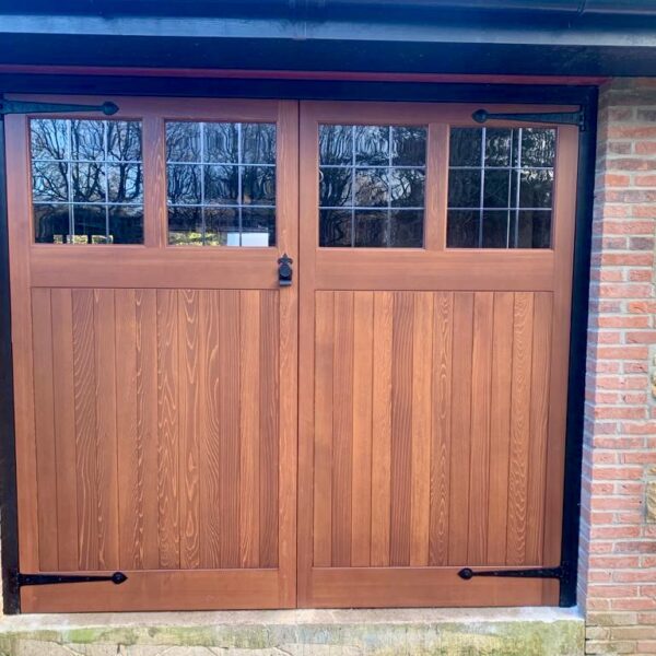 After removing the old timber doors, we installed a CDC GRP side-hinged garage door in the Betchworth style. Our customer opted for: Colour: Honey Beech. Frame and Chassis Colour: Brown.